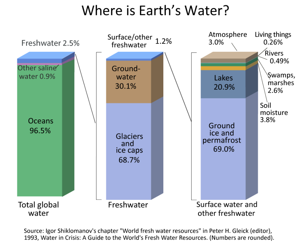 In past classes you have likely learned about the water cycle. Now that we understand how precipitation occurs, we are going to examine this cycle from a global perspective. Most of the Earth’s surface (about 70%) is covered with water. Most of this water (about 97%) contains salt and is in the oceans. This amount leaves about 3% of Earth’s water as fresh water (without salt). Slightly less than 69% of this fresh water is frozen in glaciers and the polar ice caps. Another 30% is underground which leaves about 1% of this fresh water above the surface in the atmosphere, lakes, rivers and ice on the ground. The percent of total water in the Earth’s atmosphere is about 0.001%. Only a small percentage compared to the total amount of water on the Earth.