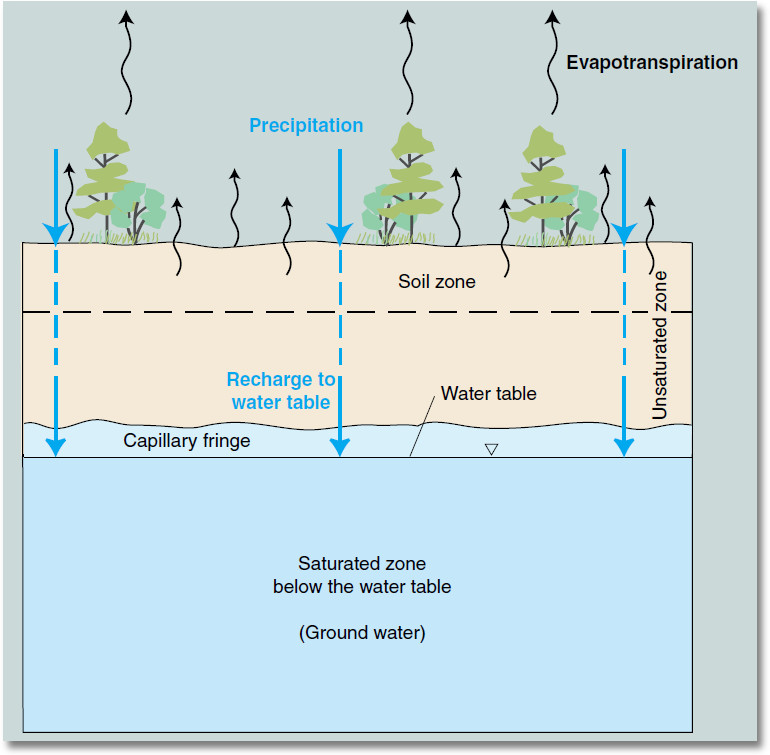 Precipitation can either become groundwater, surface runoff or evaporate. This section focuses on groundwater. Groundwater begins when precipitation infiltrates through the soil to a saturated zone. The water table is the top of this saturated zone beneath the Earth’s surface.