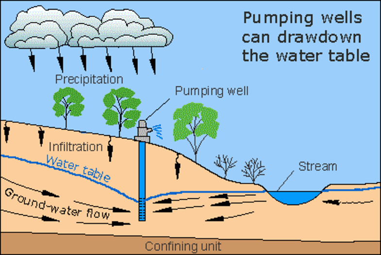 The pumping of wells can have a big influence on water levels below ground, especially in the vicinity of the well, as this next diagram shows. Depending on geologic and hydrologic conditions of the aquifer, the impact on the level of the water table can be short-lived or last for decades. Excessive pumping can lower the water table so much that the wells and nearby streams go dry.