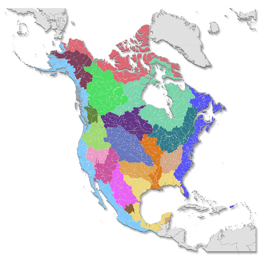 A drainage basin or watershed is an area of land that drains all the streams and rainfall to a common outlet. Drainage basins can be as small as a canyon or as large as a portion of a continent. This map shows the larger watersheds in North America. The top or highest portion of a basin where surface flow first originates is called its headwater. The end or lowest portion of river when it empties into a larger body of water is called the river’s mouth or delta.